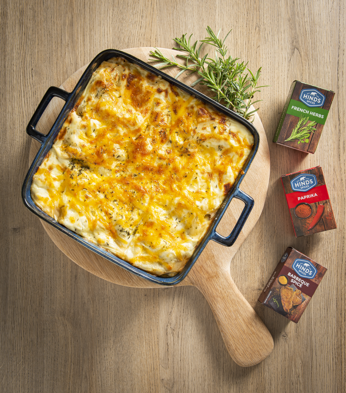 - Top with grated cheese and Hinds Spices French Herbs, bake for 45 minutes.