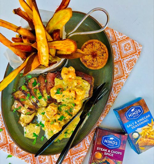 Grilled Sirloin Steak, Prawns in Creamy Lemon Sauce and Crispy Sweet Potato Sticks 5 Time: 20 minutes